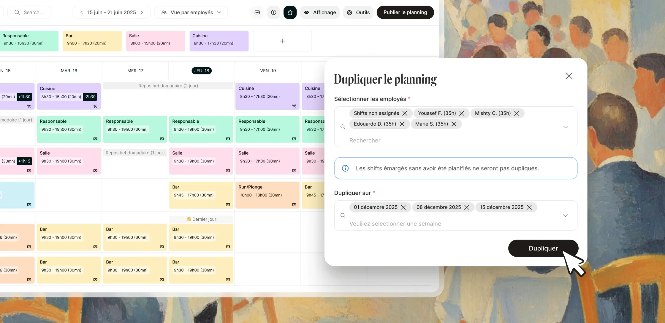 - Dupliquez vos heures/jours/semaines types en quelques clics